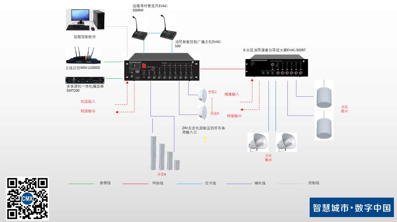 2、主控中心設(shè)計(jì):消防智能控制廣播主機(jī)EVAC-500、6 分區(qū)消防語(yǔ)音功率放大器EVAC-500RT、語(yǔ)音撤離遠(yuǎn)程呼叫站 EVAC-500RM ,多音源機(jī)一體機(jī)DMT200、遠(yuǎn)距離一拖二無(wú)線真分集話筒WM-U200D、電源時(shí)序器PA-100ST等組成。