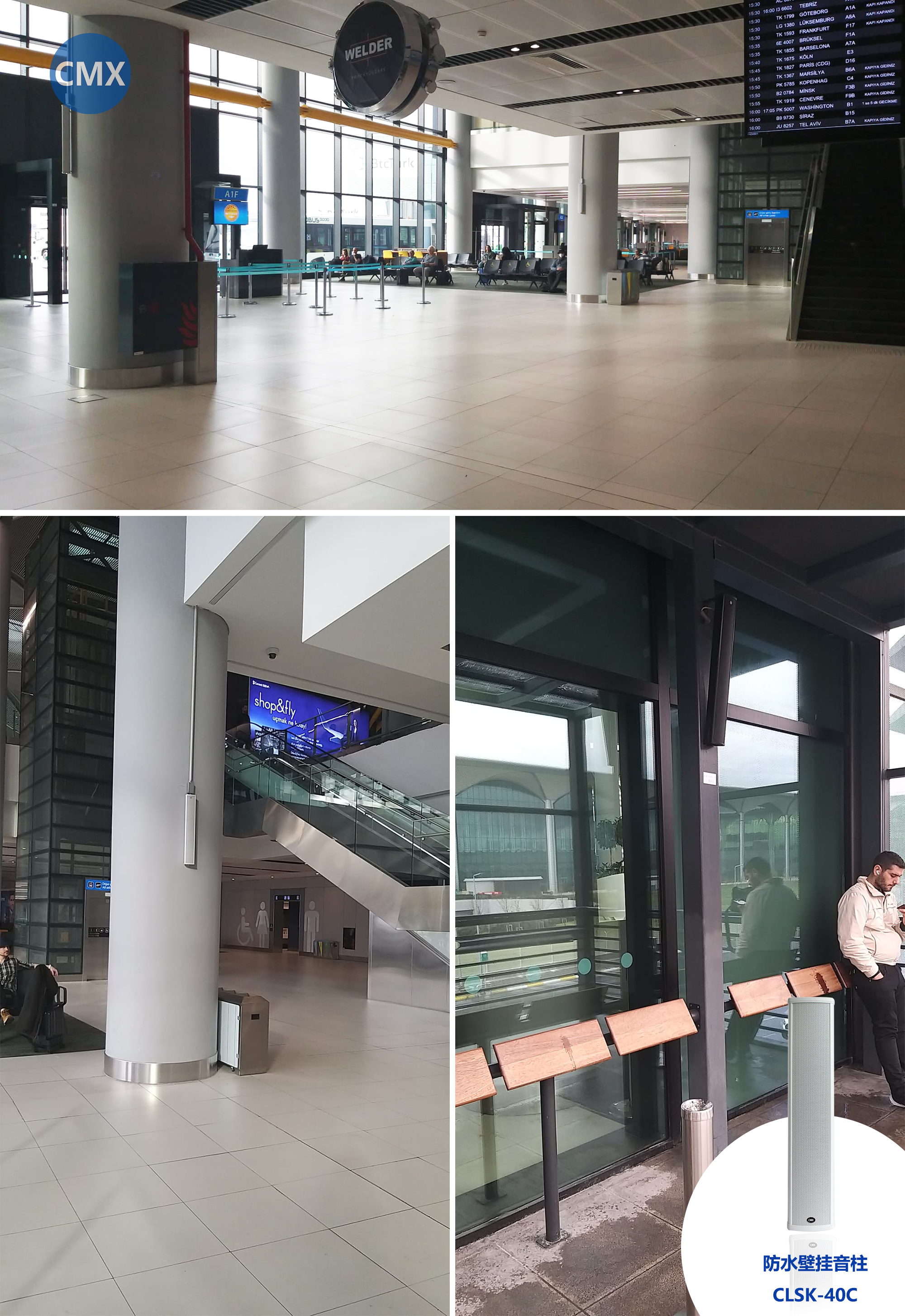 根據(jù)候機(jī)廳和吸煙區(qū)區(qū)域廣,水泥柱多,戶外防水等特點(diǎn),現(xiàn)場(chǎng)水泥柱上選用CMX的防水壁掛音柱(CLSK-40C)。