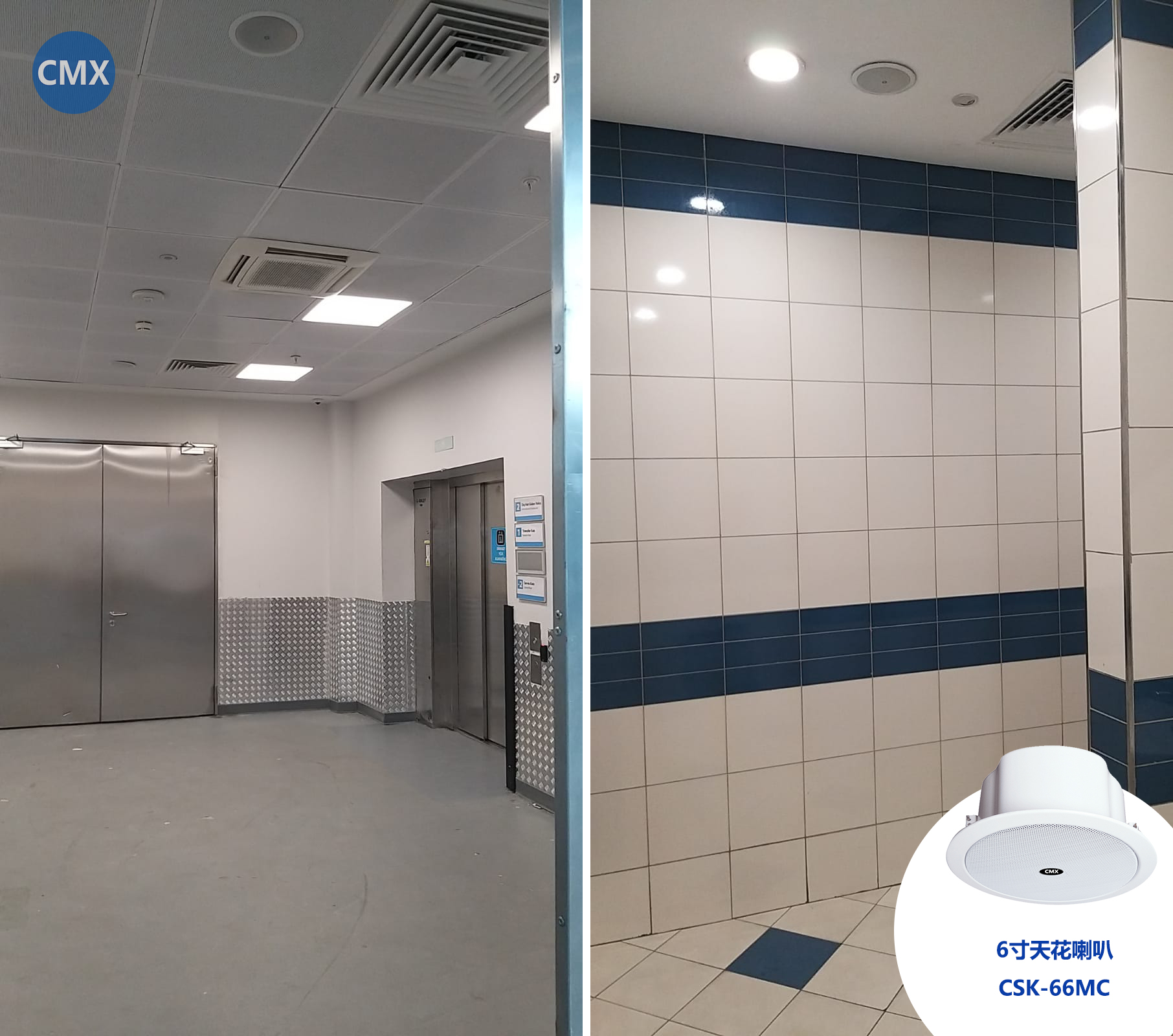 電梯口與衛(wèi)生間,區(qū)域小、美觀等需求,現(xiàn)場(chǎng)天花板上選用了CMX的6寸天花喇叭(CSK-66MC)。