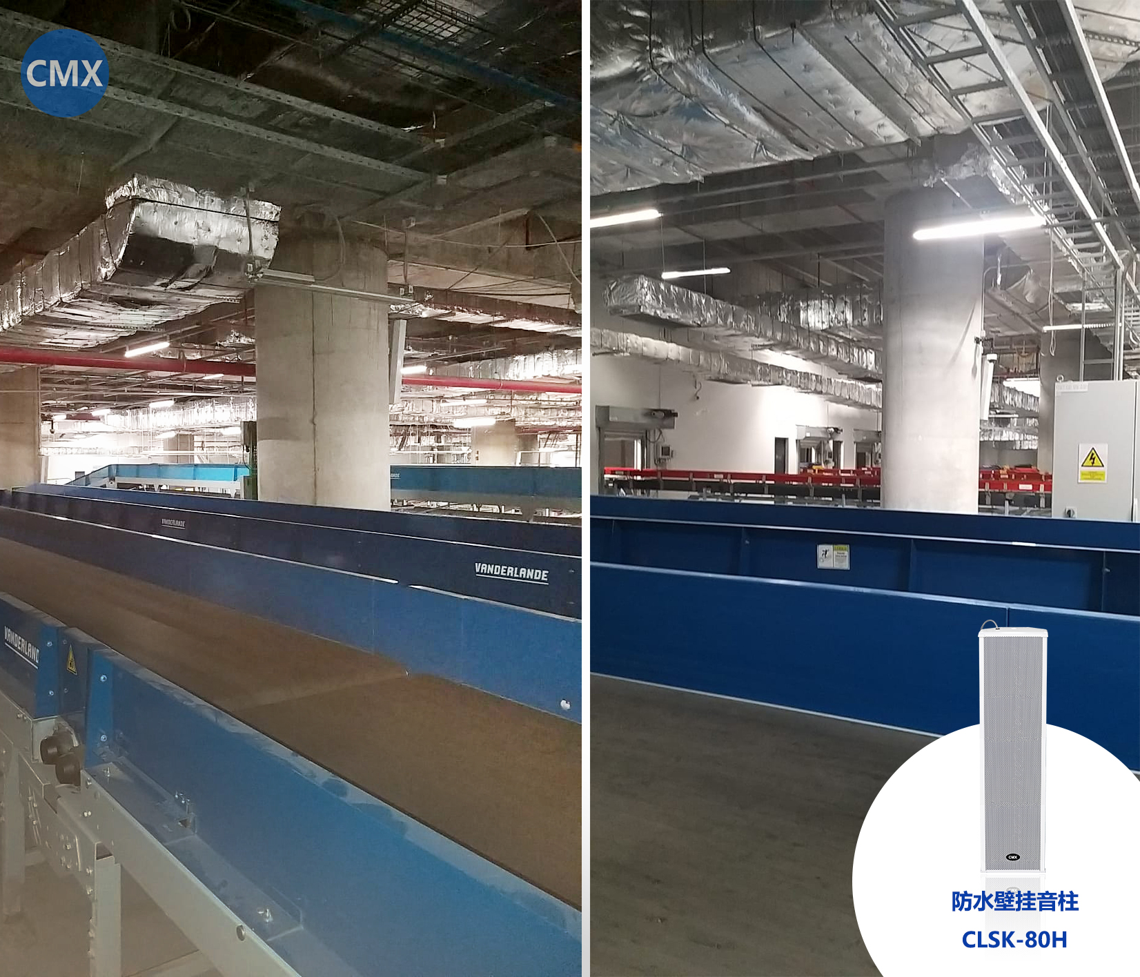 根據(jù)行李處理區(qū)區(qū)域廣,水泥柱多等特點(diǎn),現(xiàn)場(chǎng)水泥柱上選用CMX的防水壁掛音柱(CLSK-80H)。