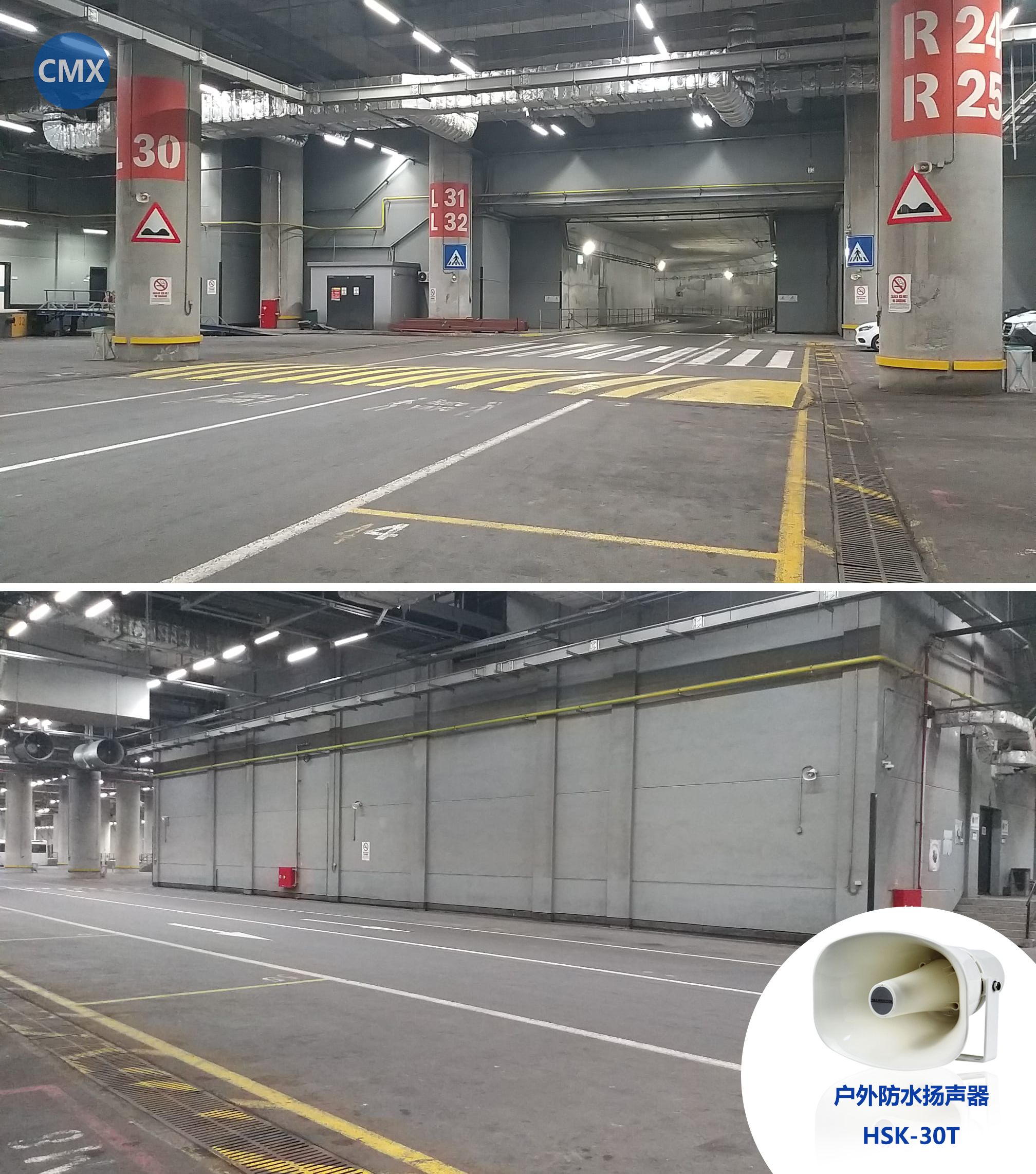 根據(jù)地下停車場(chǎng)應(yīng)急廣播的需求,每條水泥柱上都選用了CMX的防水揚(yáng)聲器(HSK-30T)。