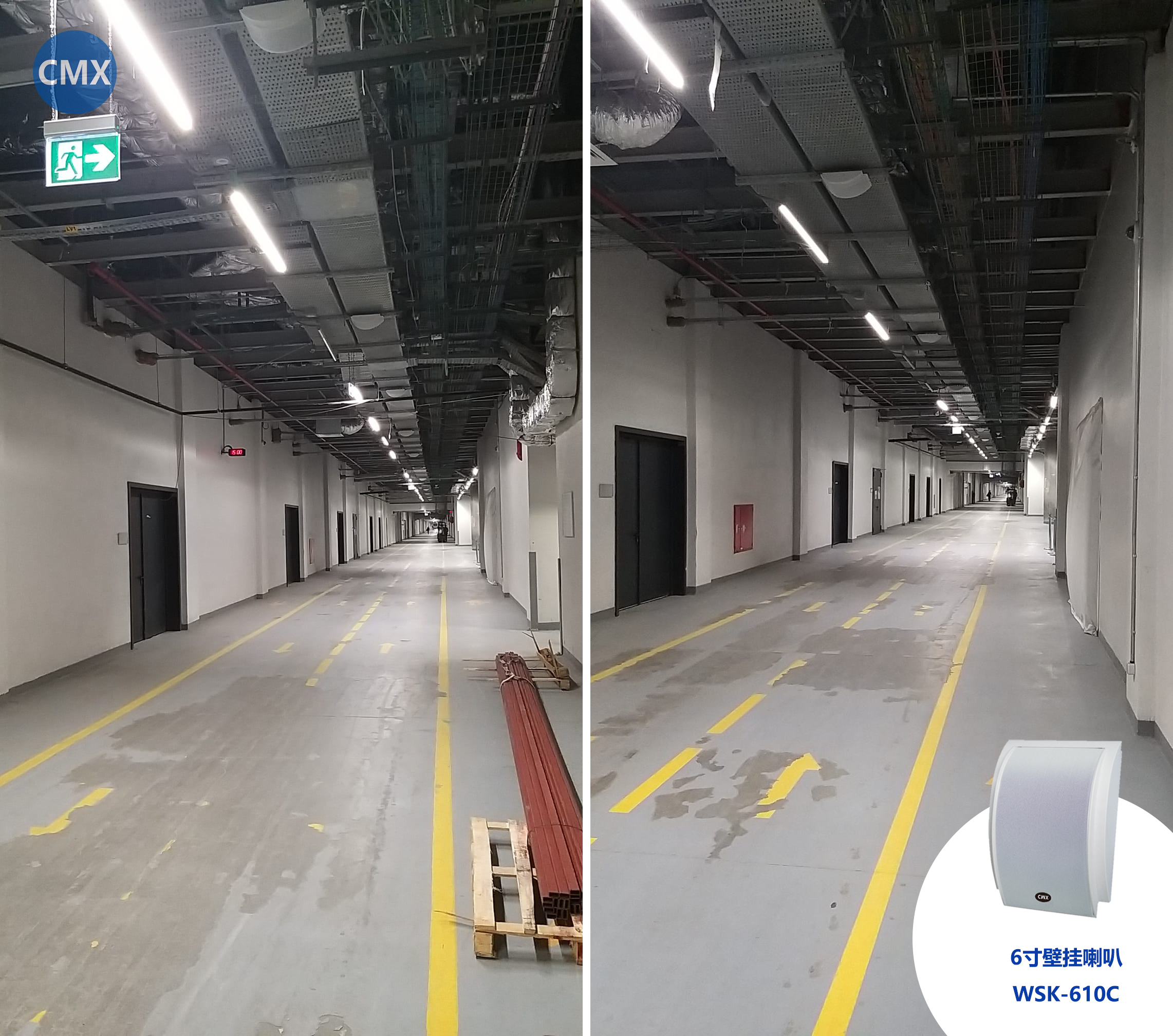 根據(jù)地下停車場(chǎng)的通道天花板特點(diǎn),選用了CMX的6寸壁掛式喇叭(WSK-610C)。